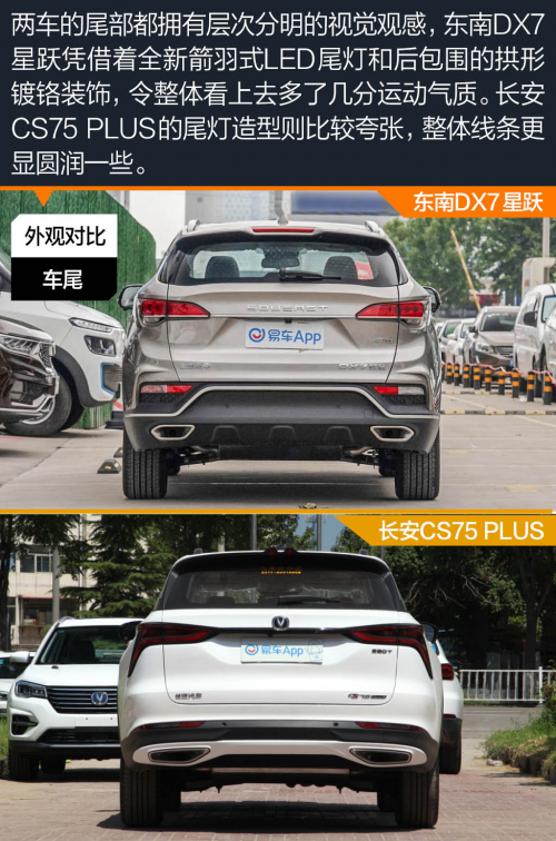 写在最后:从内外设计来看,东南DX7星跃和长安CS75 PLUS各有擅长,一个是以时尚为主旋律做到符合各个年龄层次的审美,一个则是取悦年轻人为目标。而涉及到用车来看,两车空间虽然差别不大,但东南DX7在科技、动力以及整体配置上更胜一筹,在差不多价位上,可以看出后来者已经居上了。