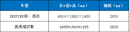空间方面,INSPIRE锐·混动和凯美瑞双擎的车身尺寸都相当可观,车身长度都超过了4.8m,轴距也都在2.8m以上,满足日常需求均不成问题。